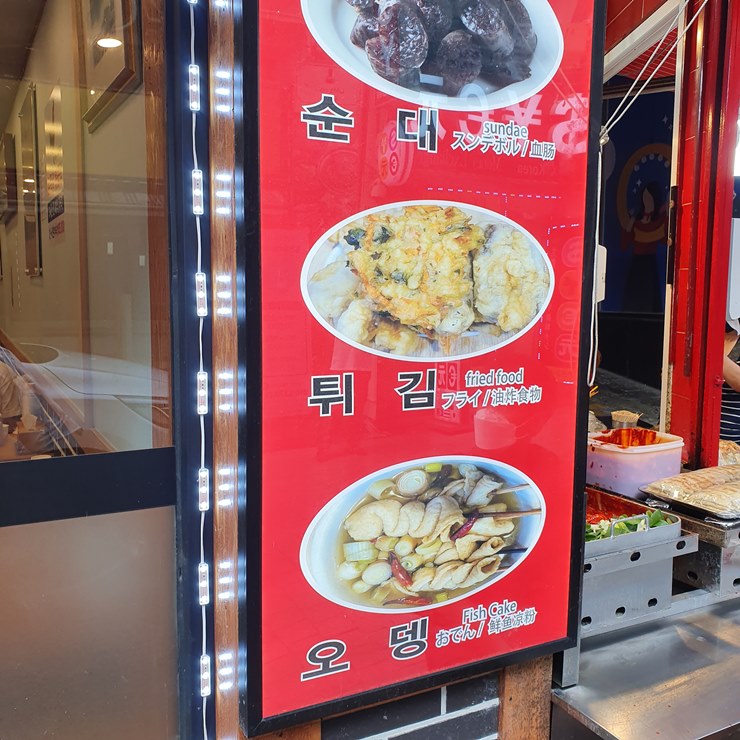 떡볶이, 순대, 군만두, 튀김, 오뎅, 김밥을 판매하고 있으며,