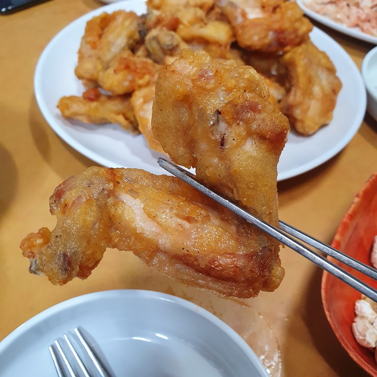 오빠들 닭다리 하나씩 먹으라고 주고, 저는 닭날개 2개를 먹습니다.