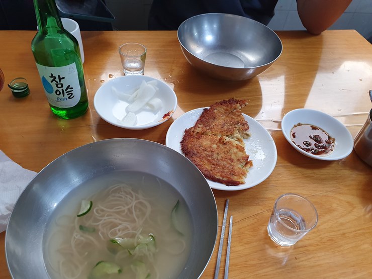 닭무침 대신 물냉면 2그릇에 빈대떡을 시켰습니다.