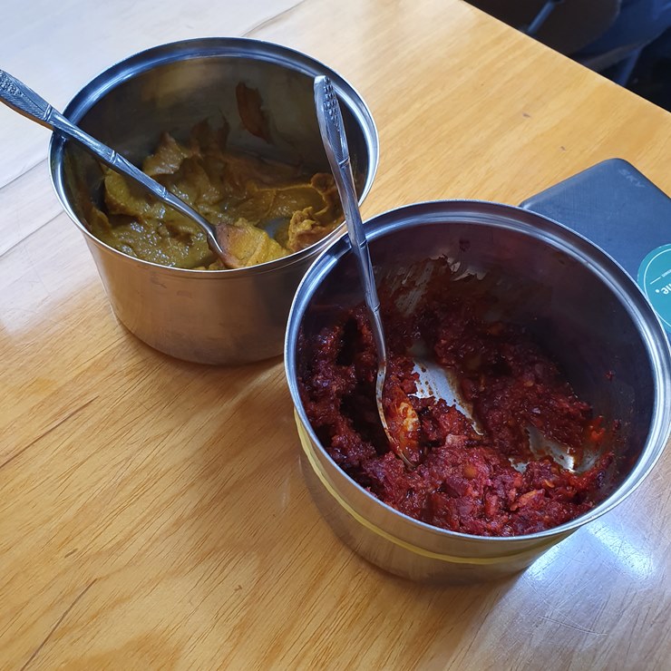 사진에 보이는 겨자와 양념장은 냉면 고명으로 올라간 돼지고기에 살짝 얹어 먹으면 맛있습니다.