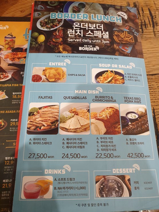 많은 멕시칸요리 전문점이 있지만, 온더보더는 일단 프랜차이즈로 평균이상의 맛을 보장하는 곳이라 실패 없이 멕시칸 음식을 즐기기에 이 만한 곳이 없다고 생각드는 곳이기도 하죠.