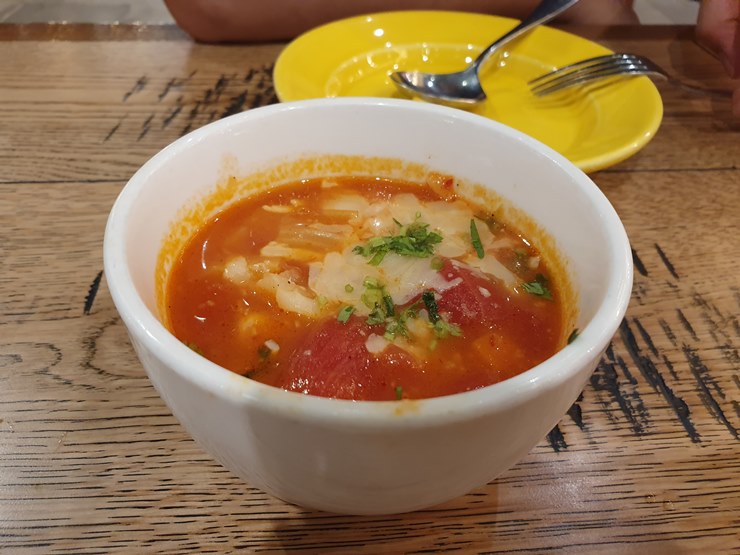 토마토소스가 베이스 된 스프로, 부대찌개 맛이 나고, 밥알이 들어있습니다.