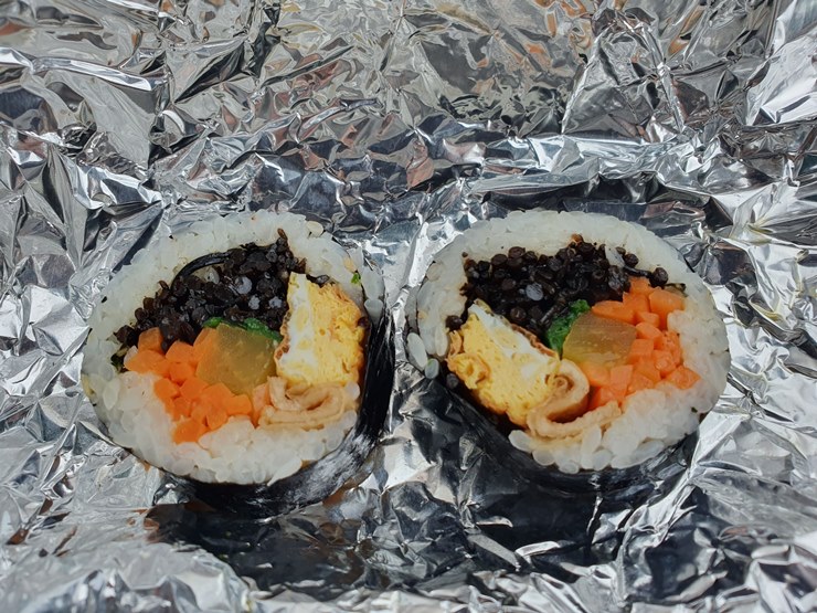 당근, 톳, 단무지, 어묵, 계란, 부추가 들어간 거제도 톳김밥.