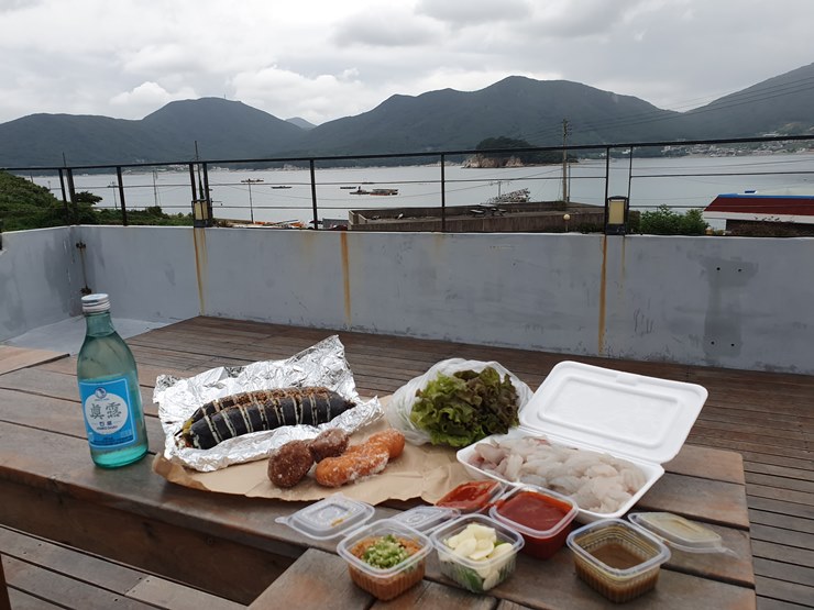 캠핑을 마치고, 예약한 거제 뷰 맛집 숙소 옥상에서 도너츠, 막회, 톳김밥을 먹어봅니다.