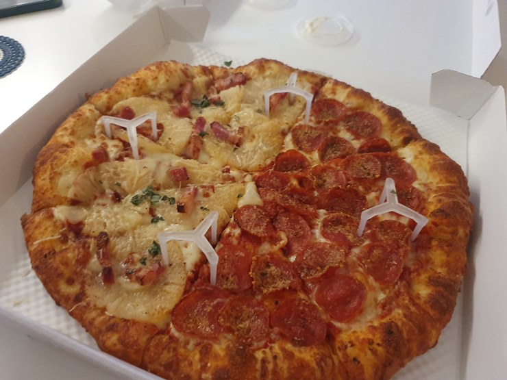 우리부부는 라지 하프앤하프 하와이안과 페퍼로니 조합으로 시켰습니다.