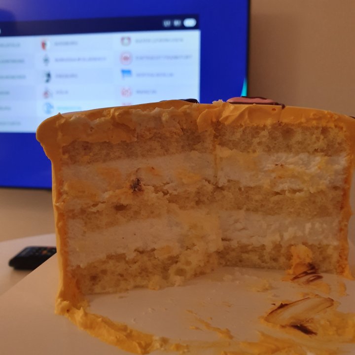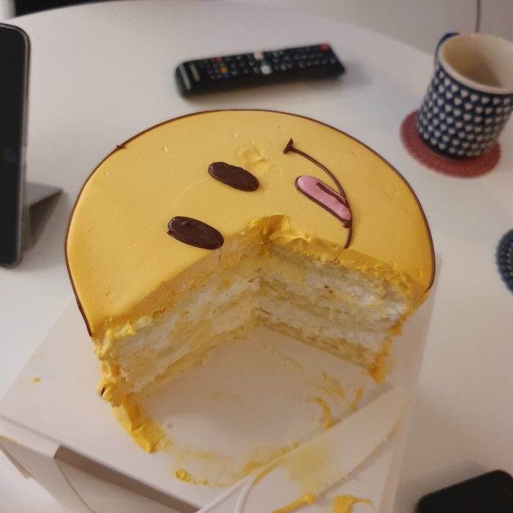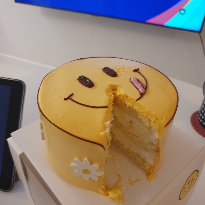 노티드 옐로우 스마일 케이크 절단 단면입니다.