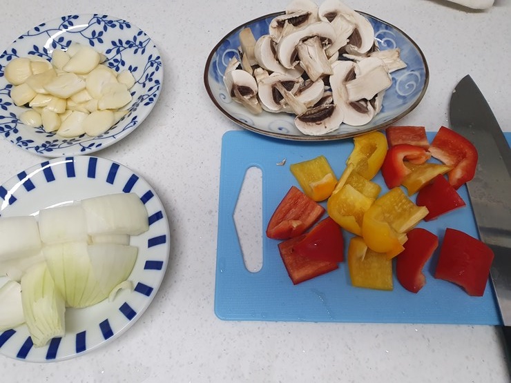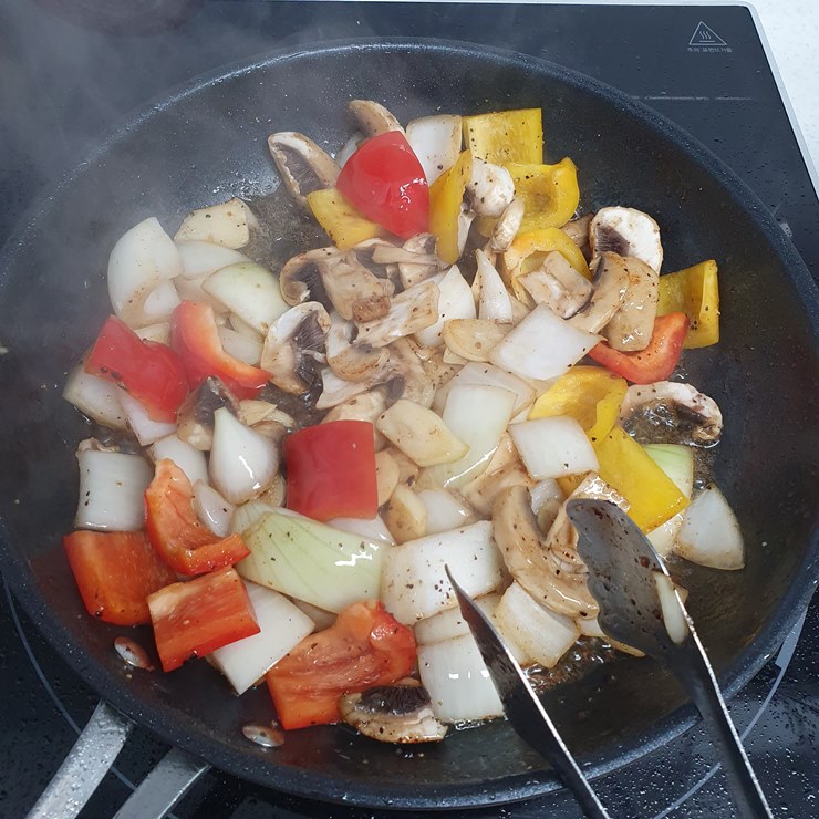 양송이, 파프리카, 양파, 마늘.