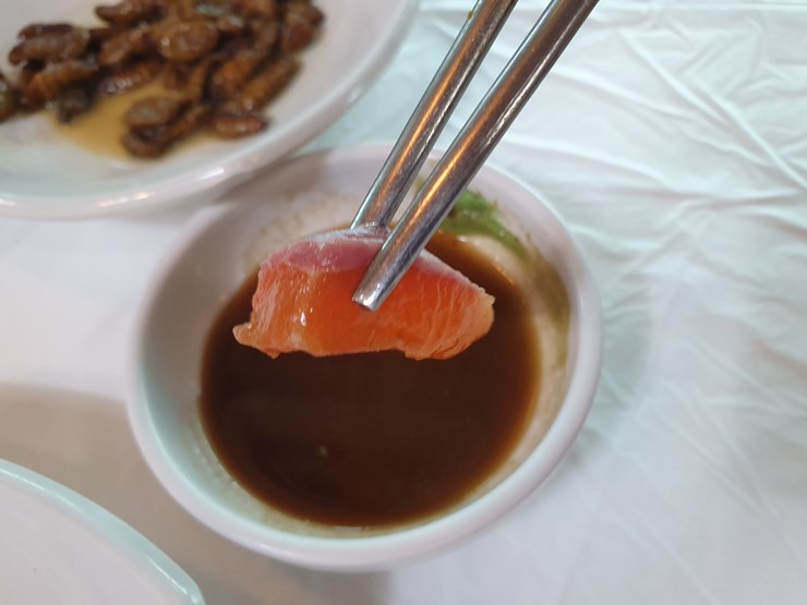 송어회 중에서 작게 썰린 것을 하나 집어서 간장을 콕 찍어 먹어봅니다.