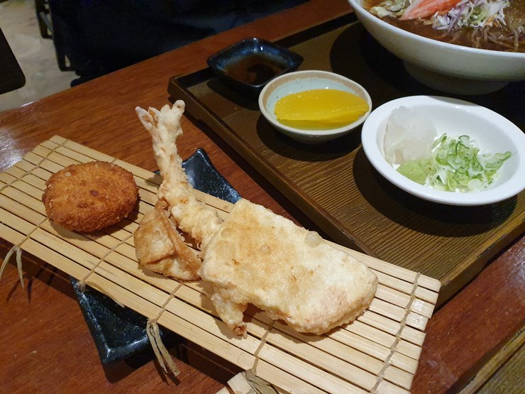 튀김냉소바에 포함된 튀김으로는 만두, 새우튀김, 고구마튀김, 고로케로 구성이 되어있습니다.