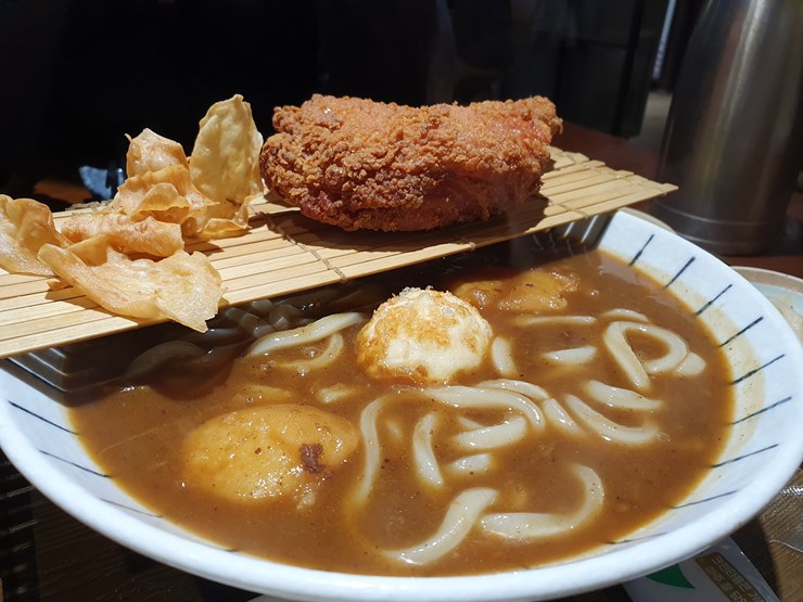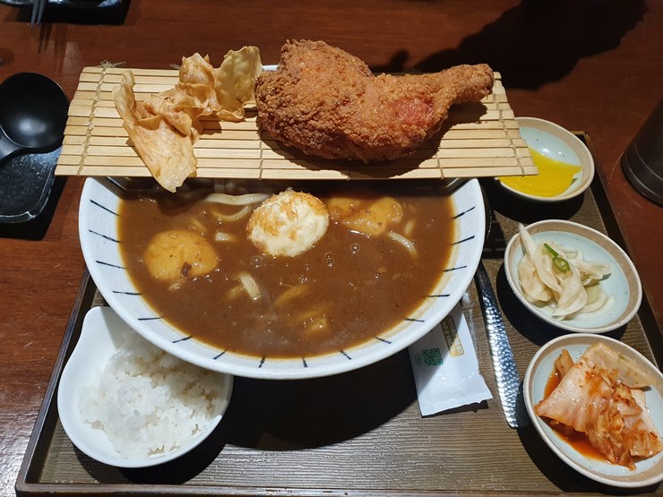 카레우동에 닭튀김이 함께 나오는 메뉴 구성입니다.